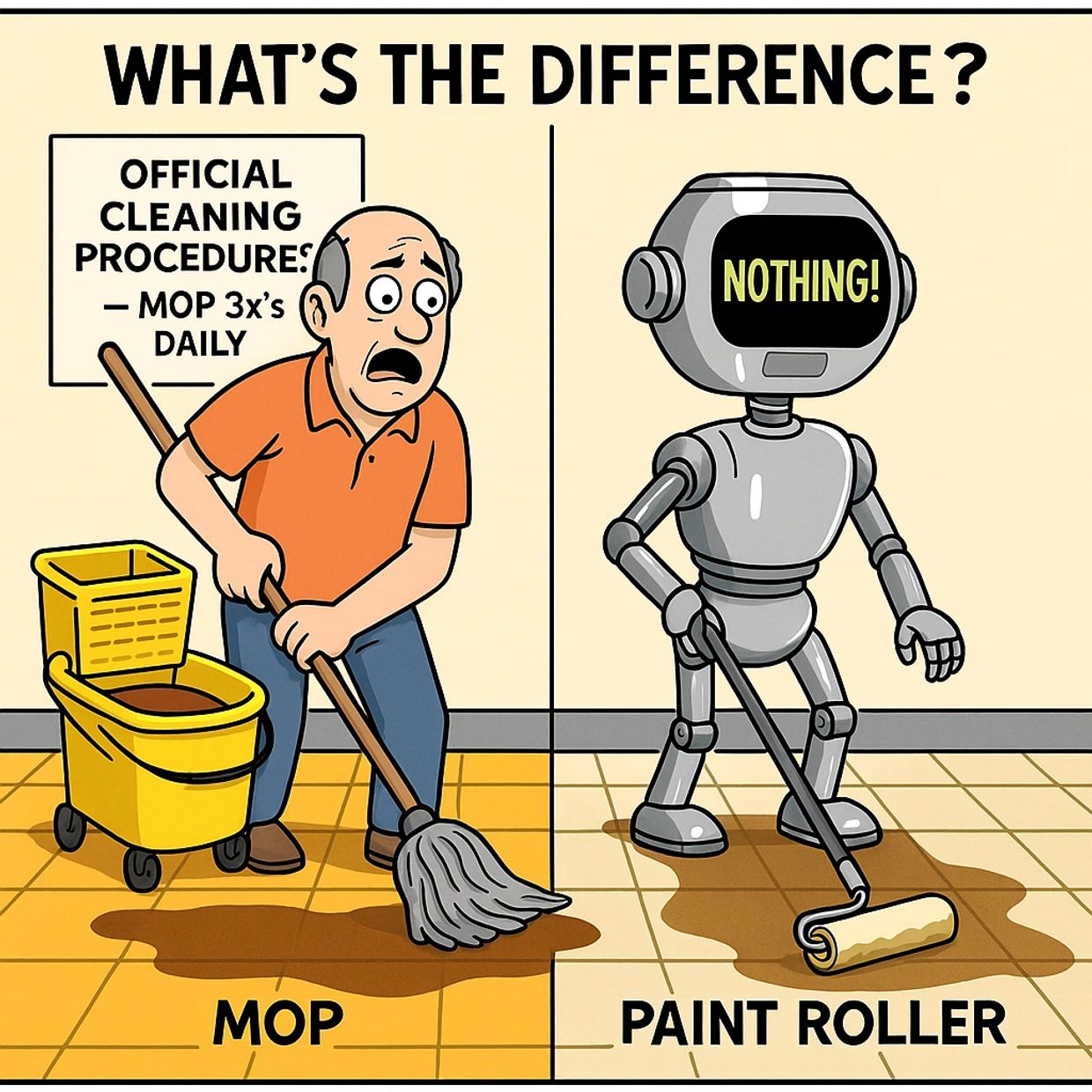 The white grout is gone - buried under contamination spread by mopping. This isn't neglect. This is the result of doing exactly what you were trained to do.